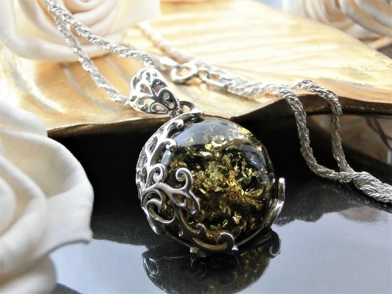 アンバーを優しく包み込むシルバーには、バルト海の波やバルトにゆかりのある植物たちが模られています。