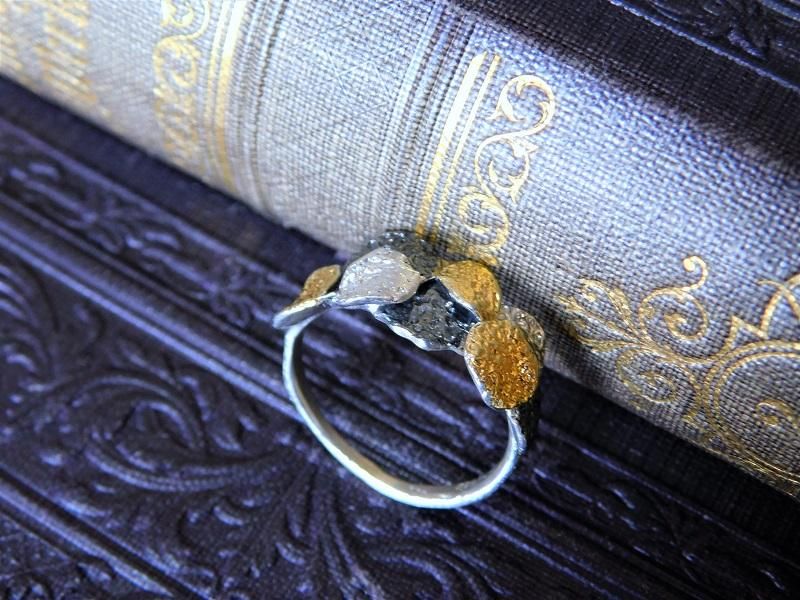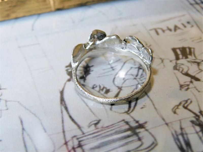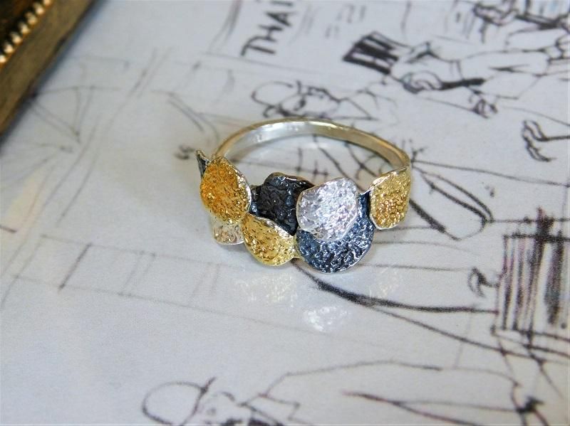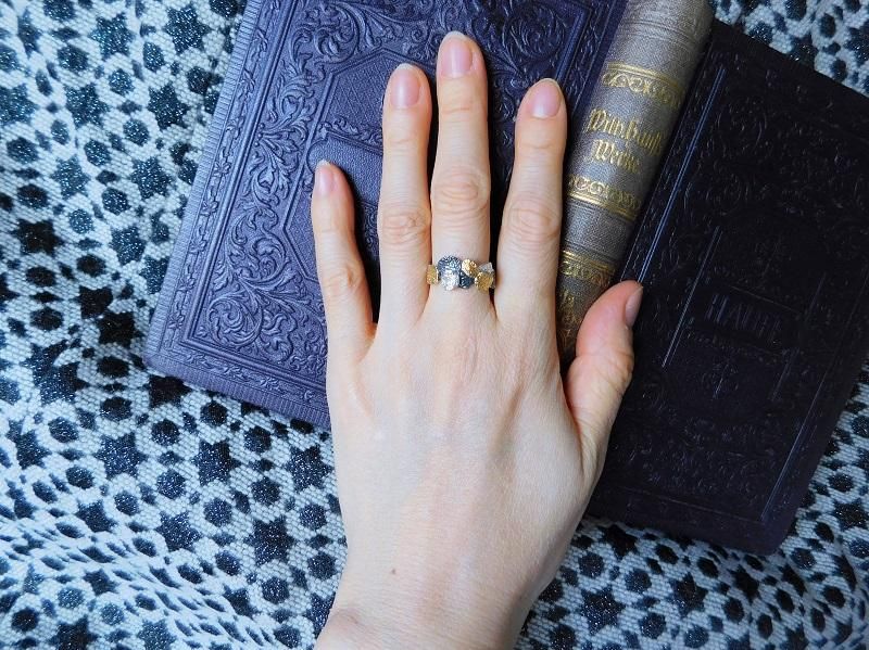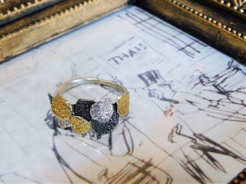 リングの上で重なり合う葉の色は、金銀、そして濃いグレーの3種類。