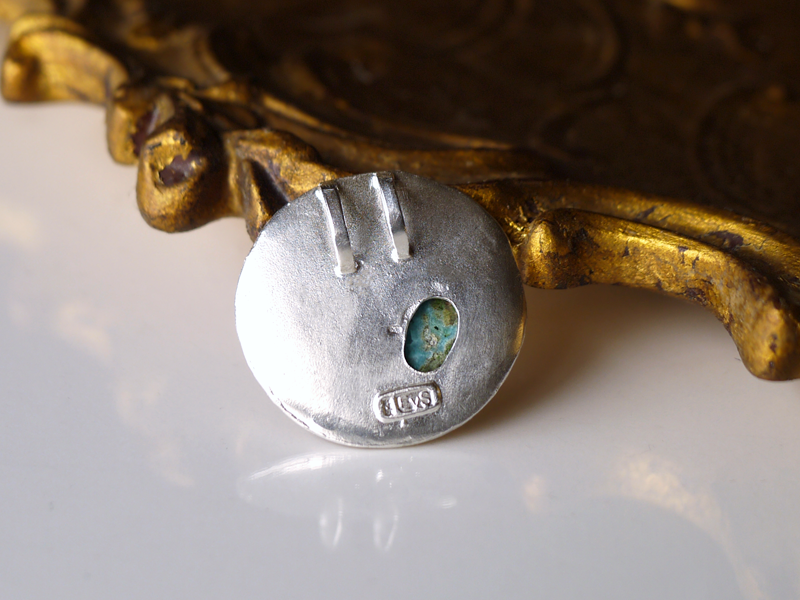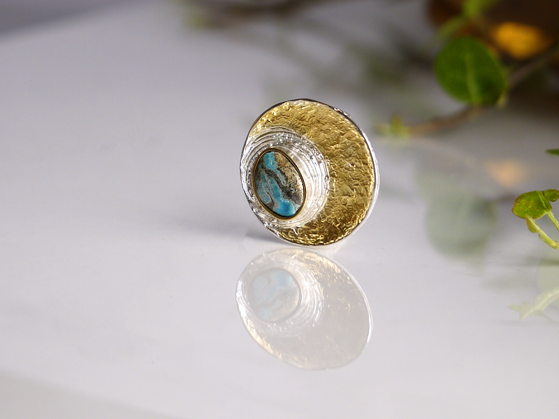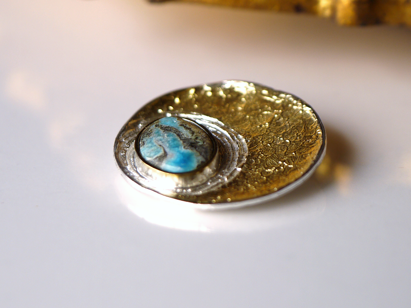 斜め下に設えられたクリソコラの地球、それを渦状に包み込む銀、