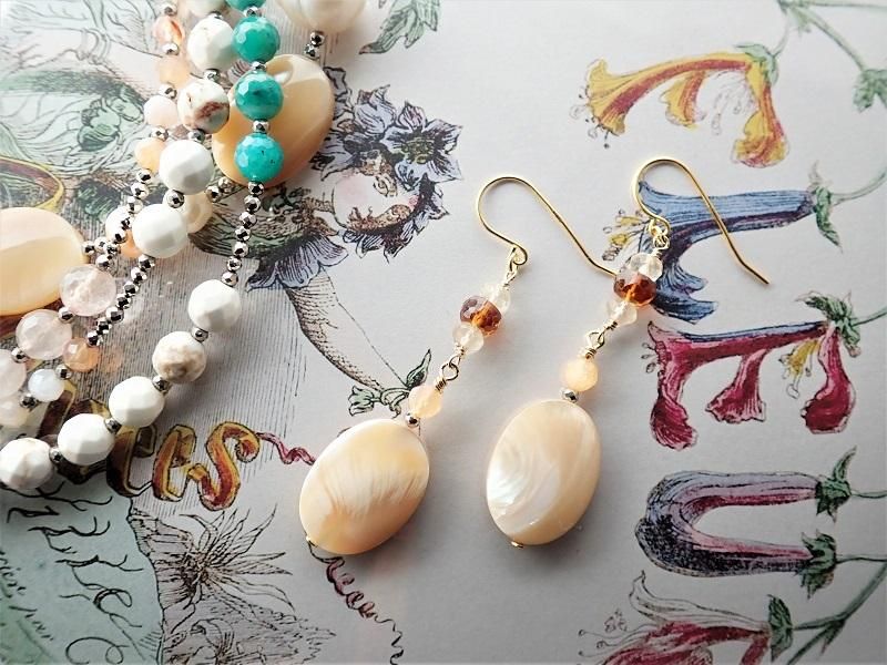 柔らかなベージュのマザーオブパールをメインに、オレンジカルセドニーを添えたデザインは、
