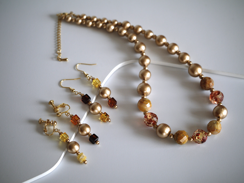ランプの灯りみたいに素敵な金色をしたネックレスとイヤリングの出来上がりです!