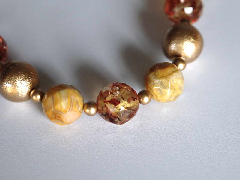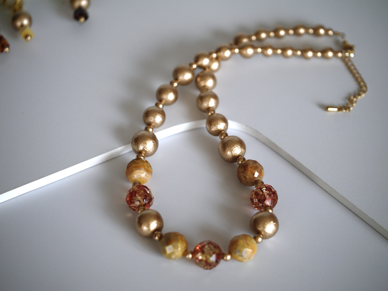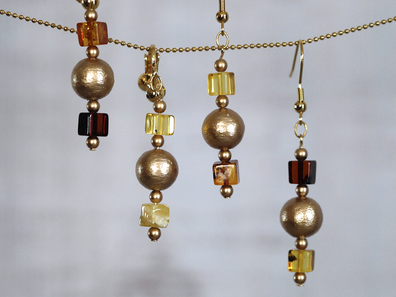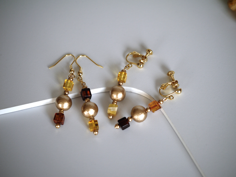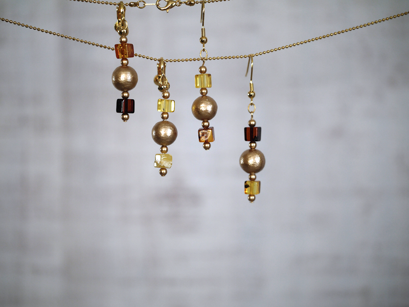 金色コットンパールと琥珀のランプ風ネックレス&イヤアクセサリー