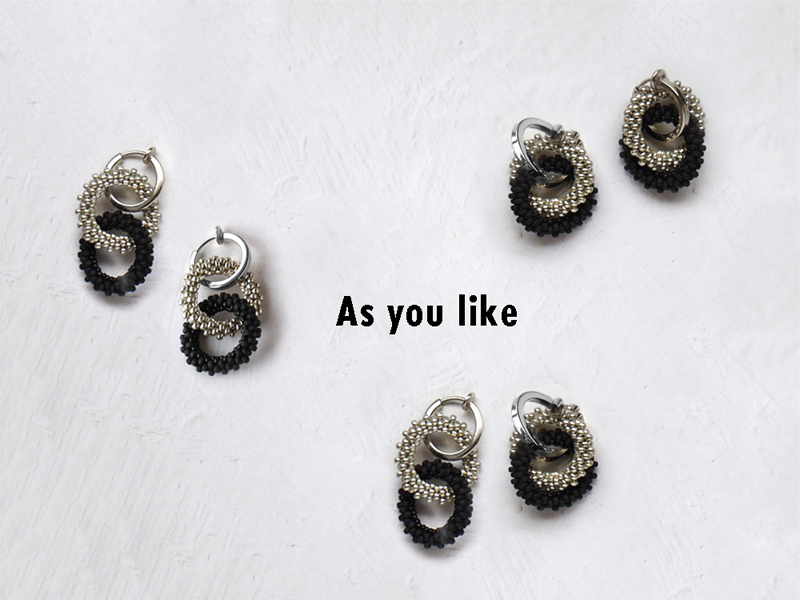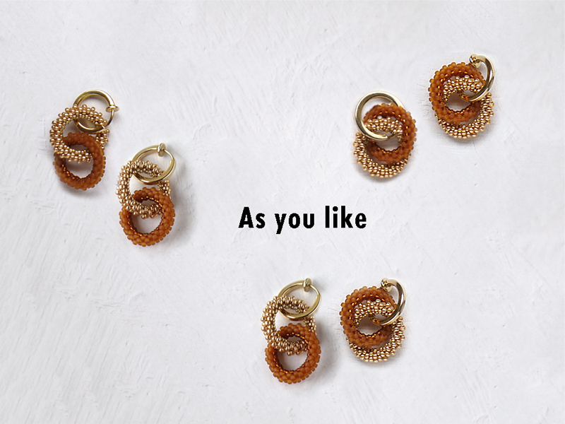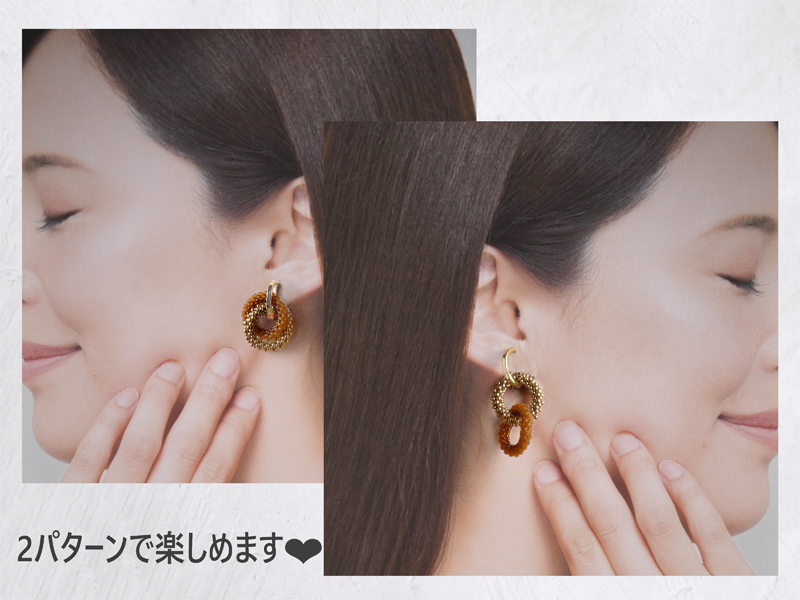 イヤアクセは金具の通し方を変えるだけで2パターンのスタイルになる仕様です。