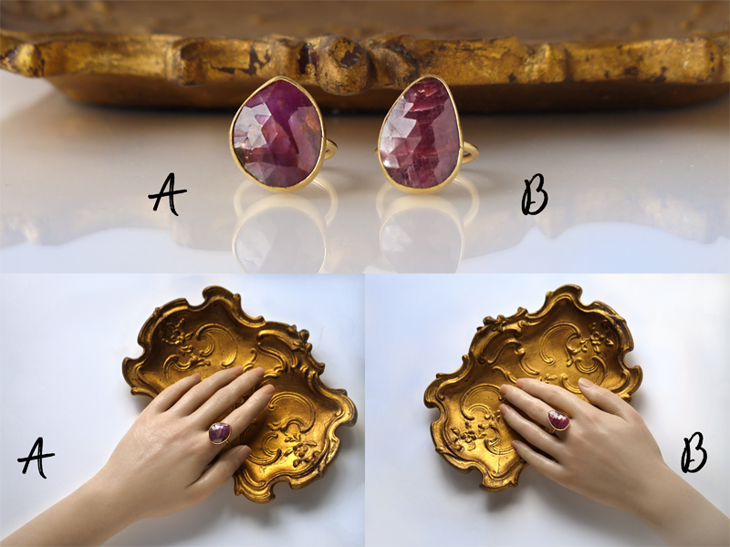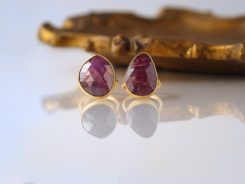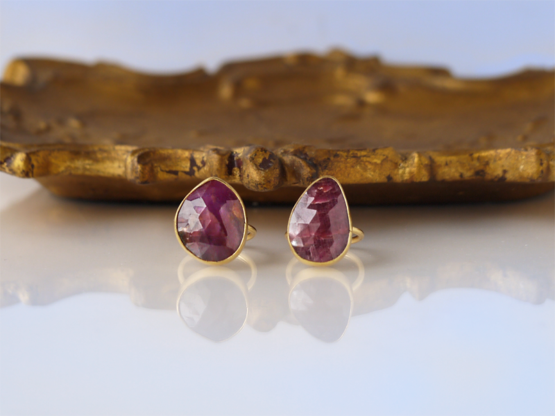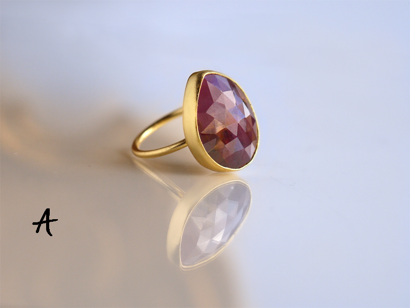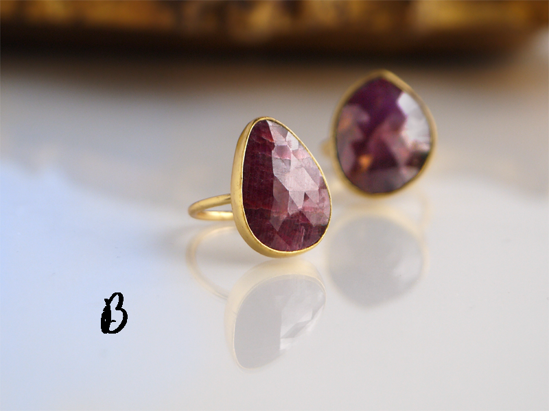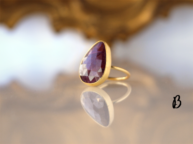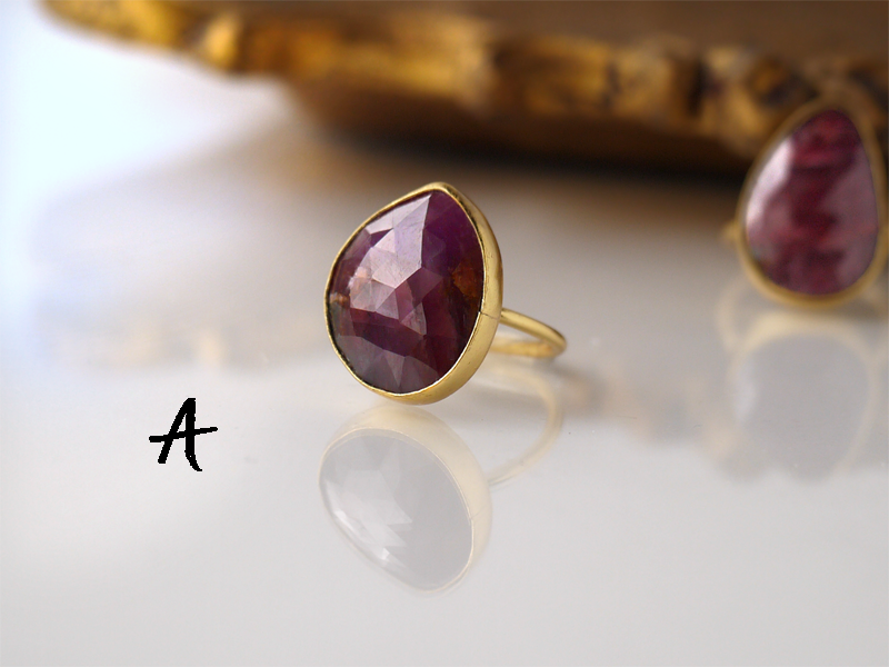 こちらのリングのサファイアは、ルビーの仲間に入れたほうがいいような赤みのあるスミレ色。
